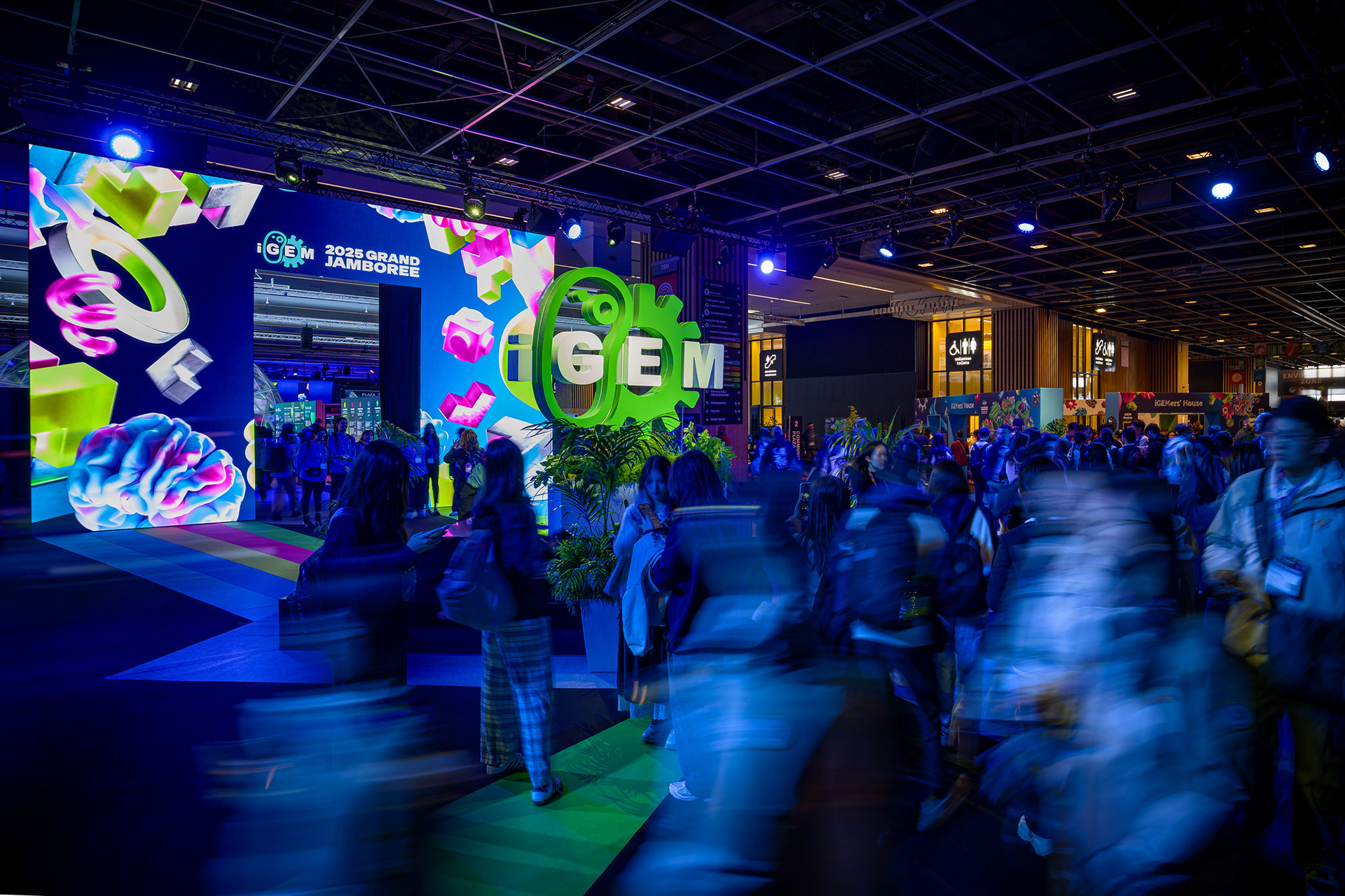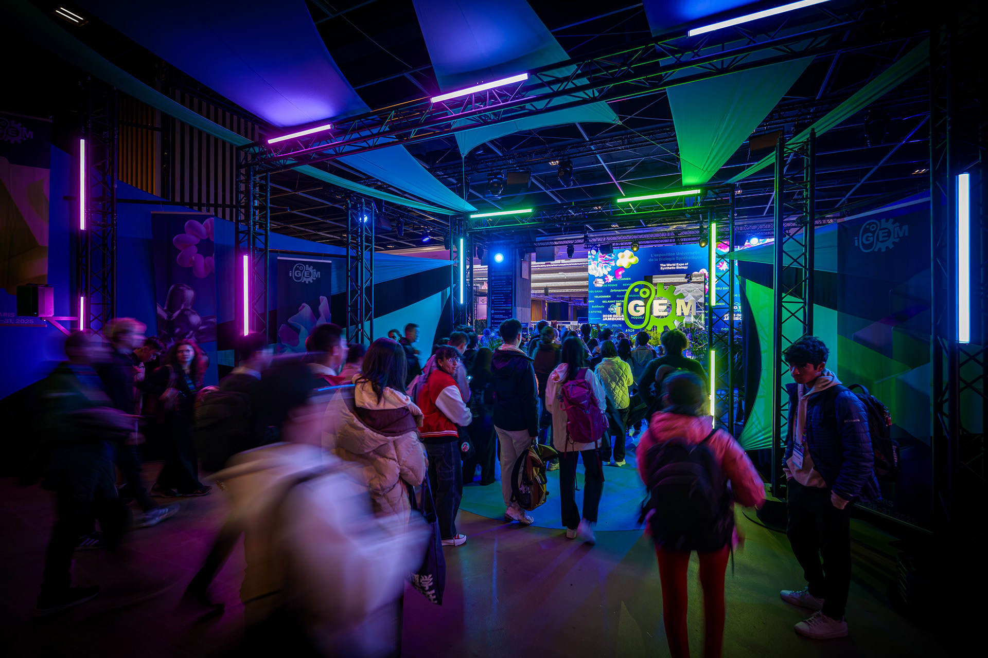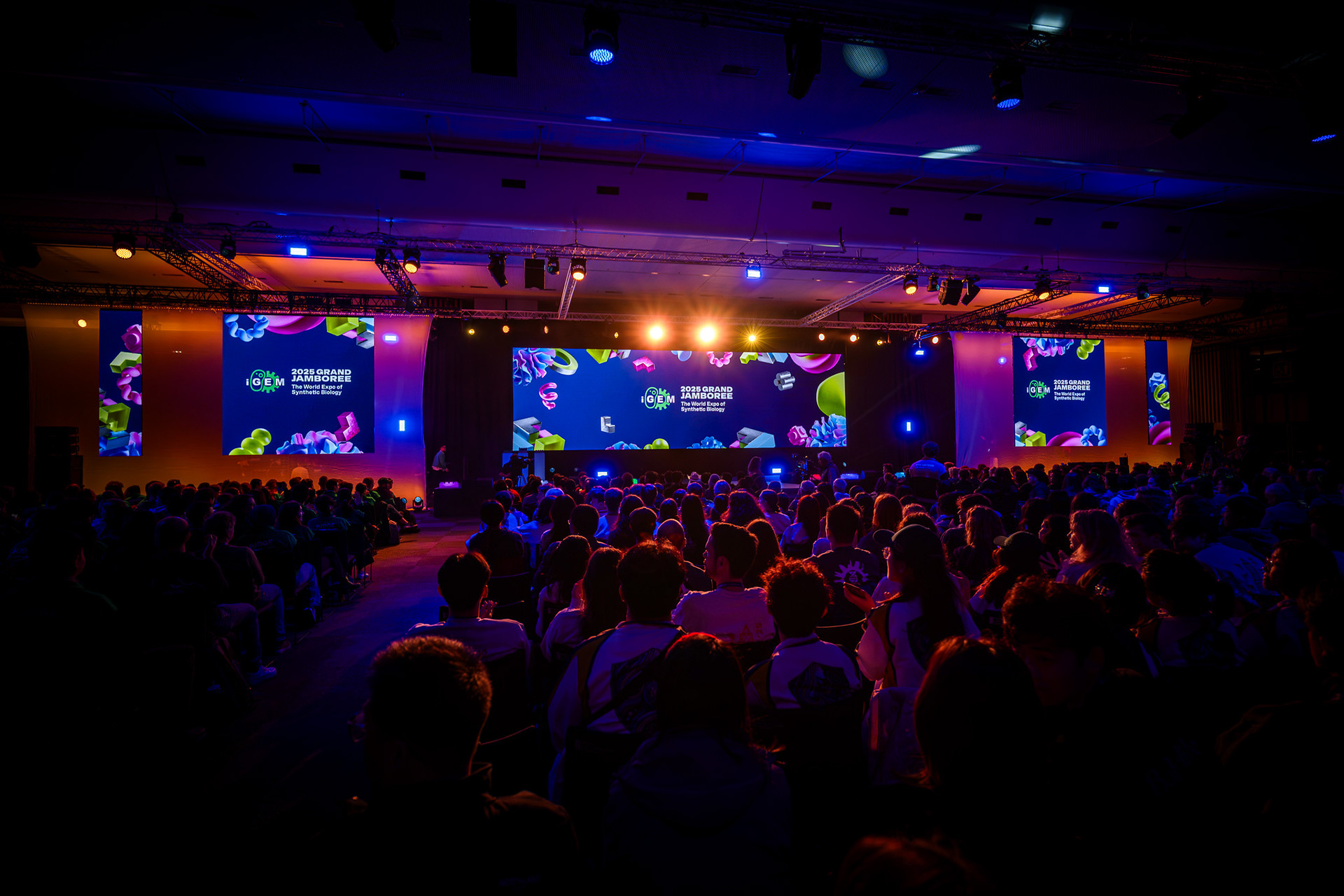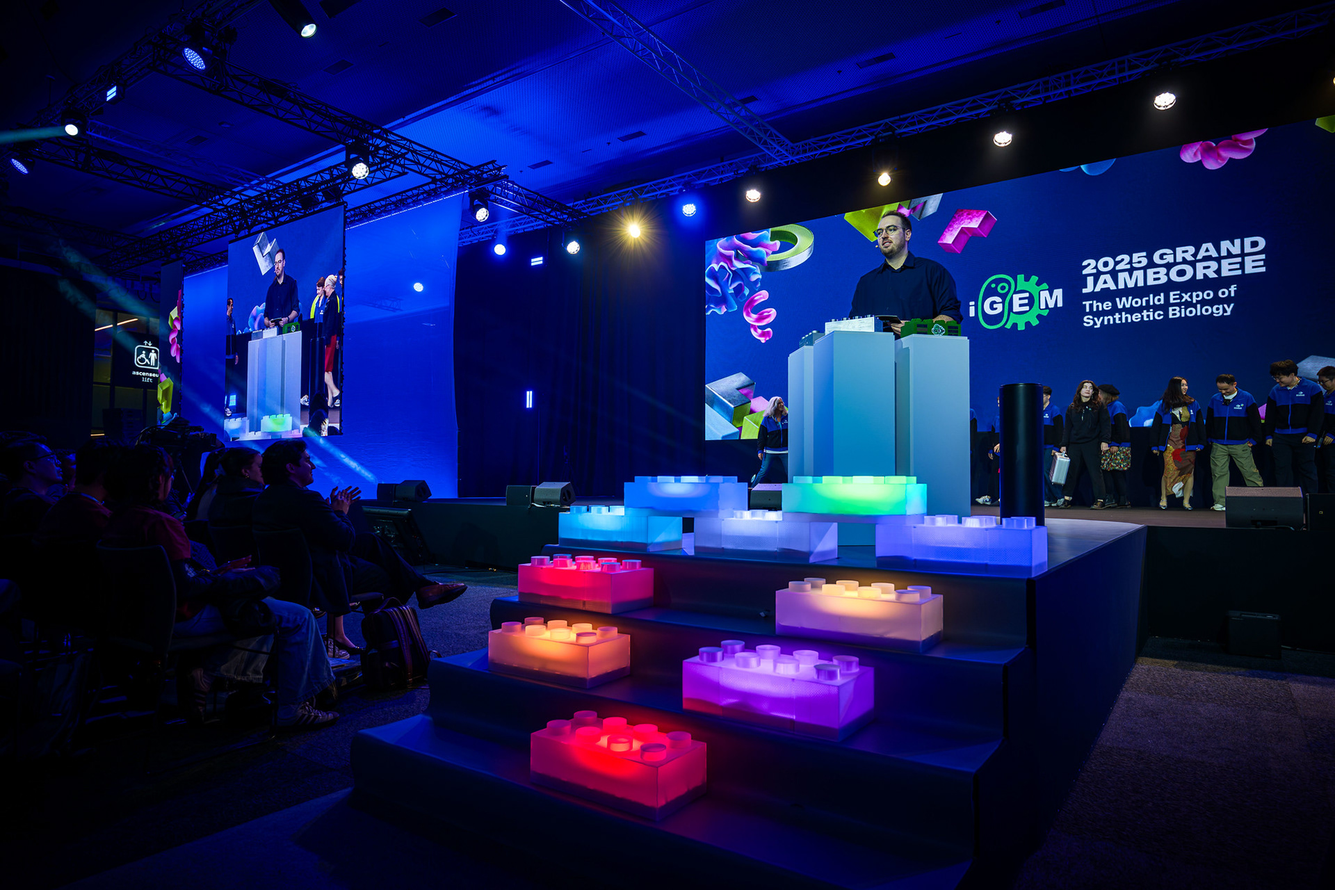 The iGEM Grand Jamboree is an annual competition program hosted at the Porte de Versailles in Paris, welcoming over 400 global teams. Every year, the competition incentivizes multidisciplinary and innovative synthetic-biology projects aimed at solving the world's most pressing problems. In 2025, working with iGEM's CEO, Nemanja Stijepovic, and Director of Production, Orsolya Szánthó, we managed multiple vendors and prepared detailed plans to organize the four-day event. Part of the Associate Production Coordinator's responsibility includes supervising load-in, creating creative directions for the main stage and lobby, troubleshooting any technical issues, and, more importantly, supporting the iGEM team members. I am ever so grateful for the opportunity to be a part of iGEM's Staff and contribute to the passion and creativity of student team members, exhibitors, and my fellow Staff members.