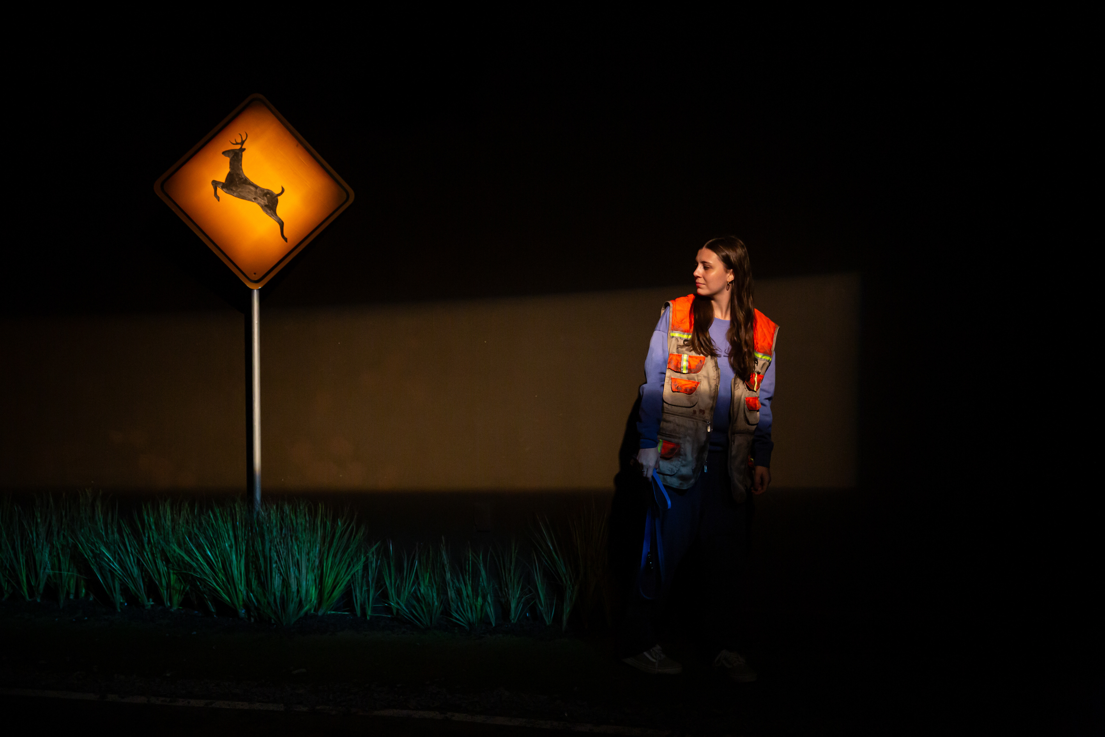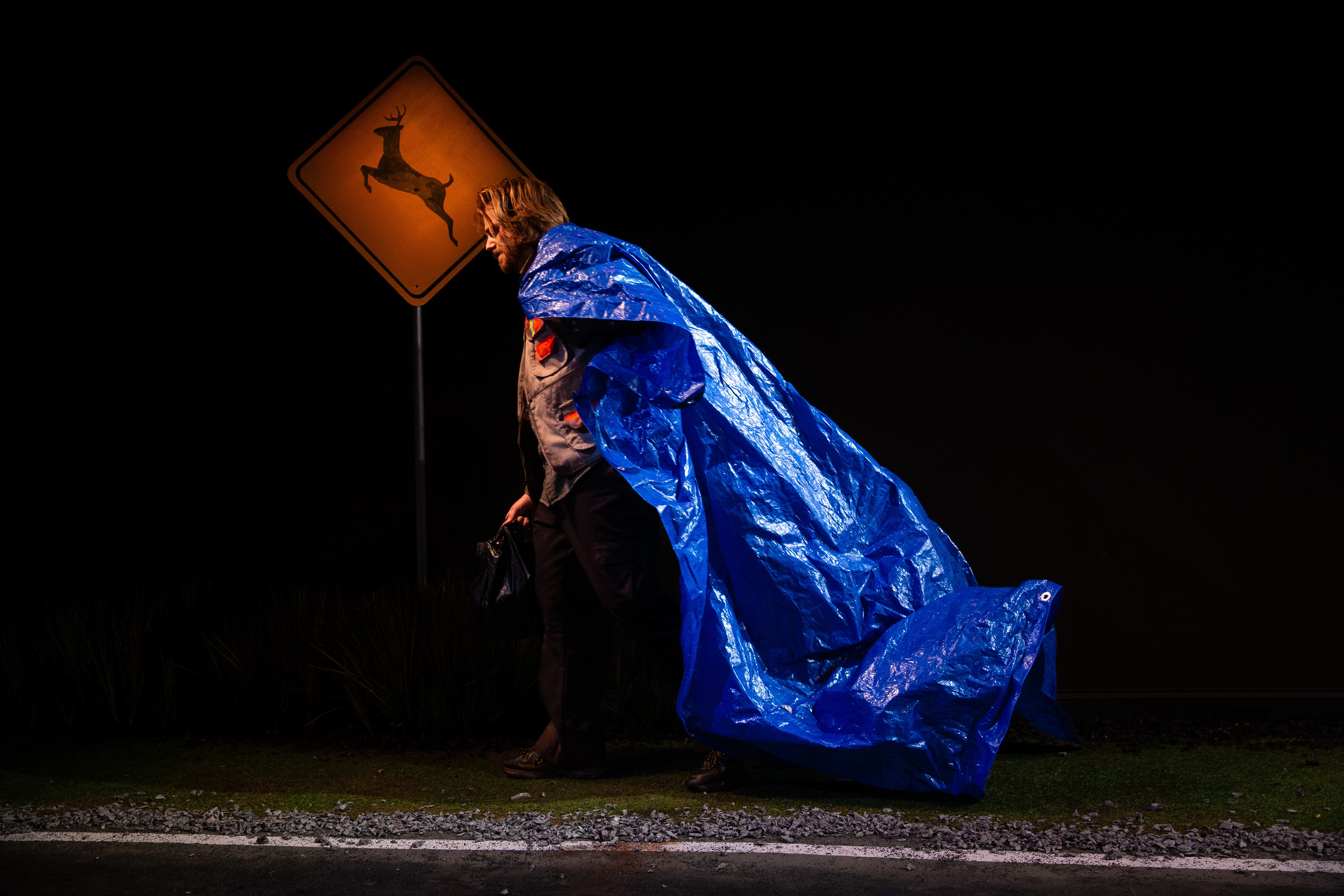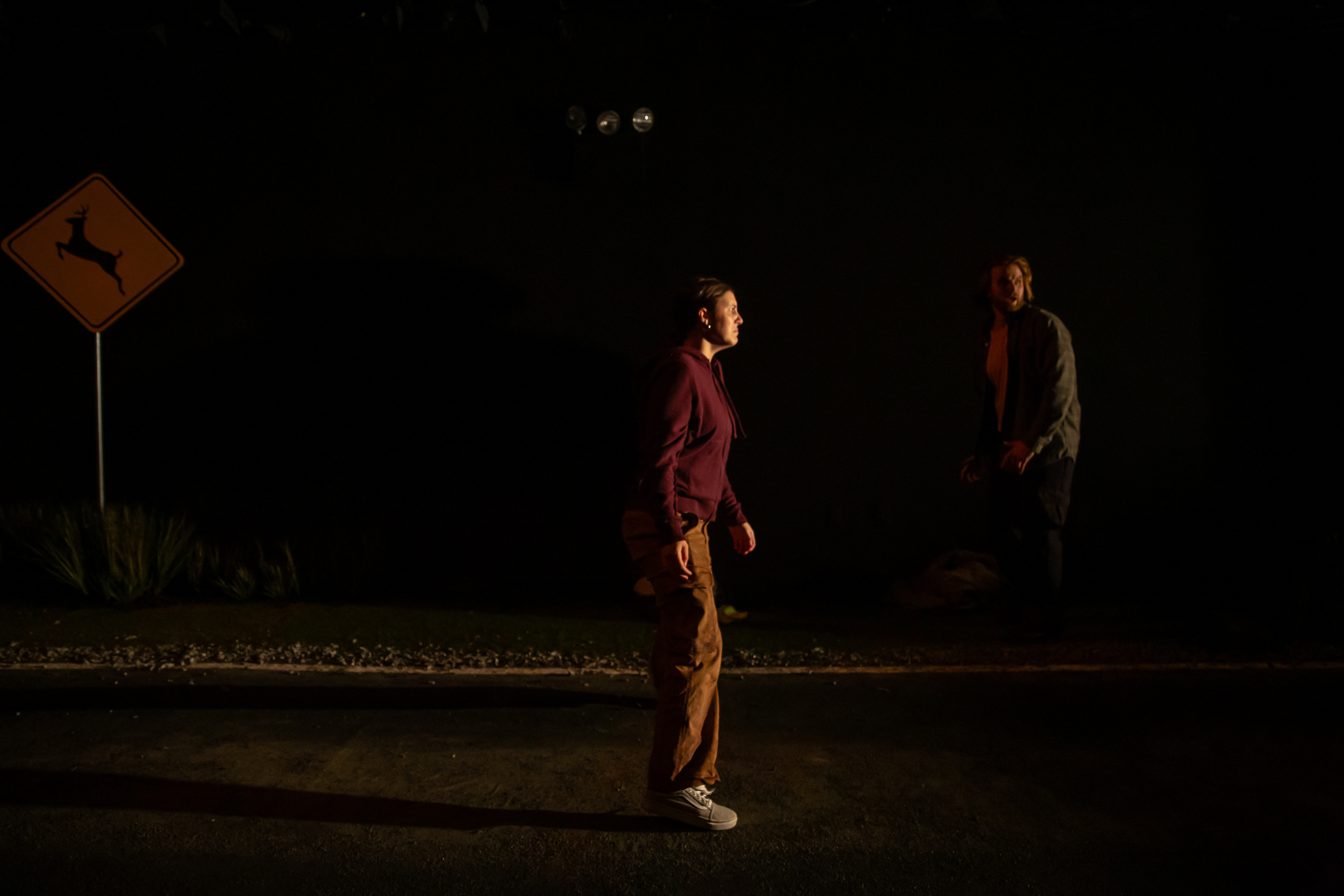 I was gifted with Sophie McIntosh's scene transitions as mini-radio episodes, revealing how the roadkill demise occurred before Jaki and Owen come for the pickup in the next scene. Paired with Paige Seber's lighting design, I wanted this transition to emphasize the naturalism sound imaging, and shift the audience's listening experience – from side of the road to hitchhiking in the backseat of someone's vehicle – from passive to active.