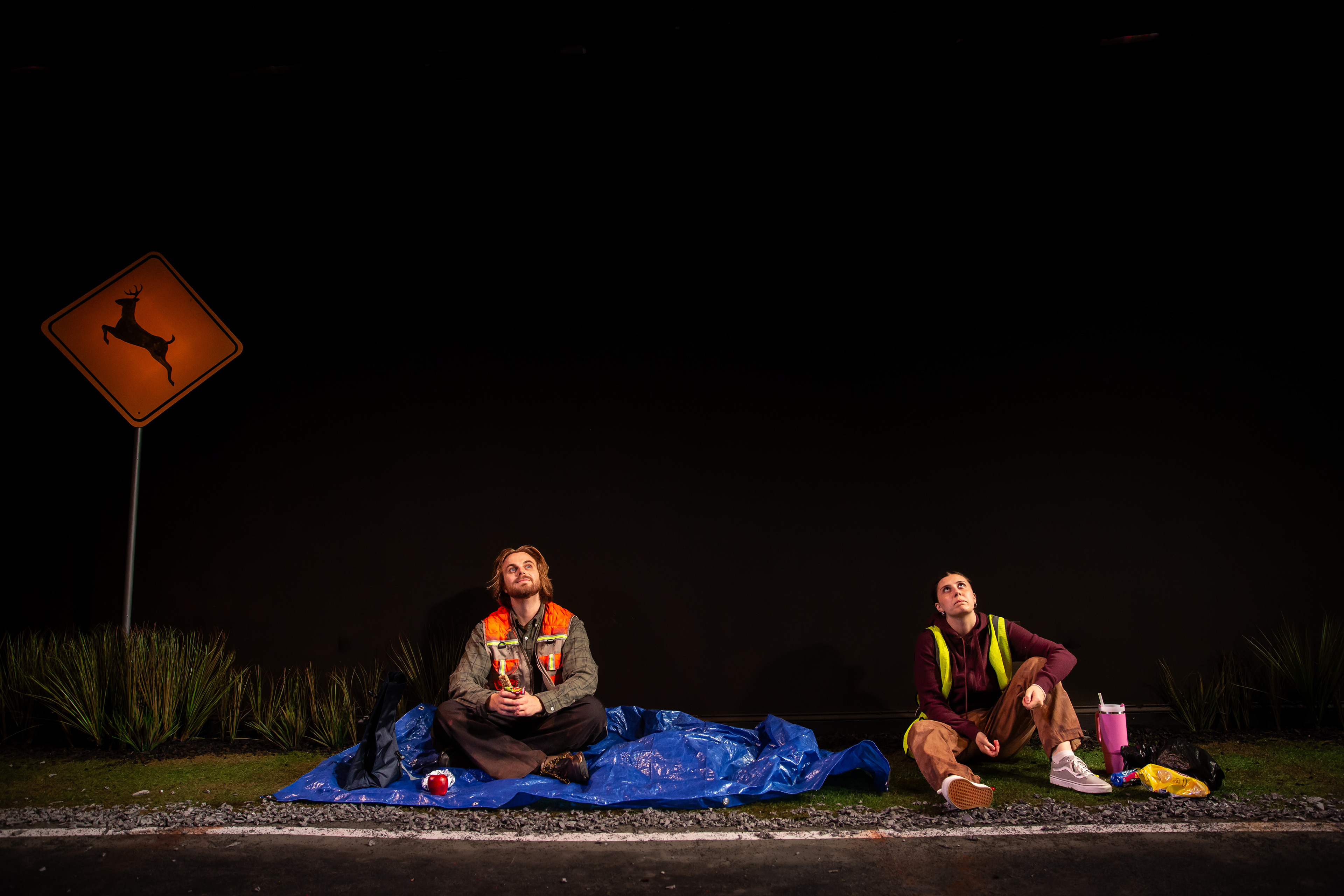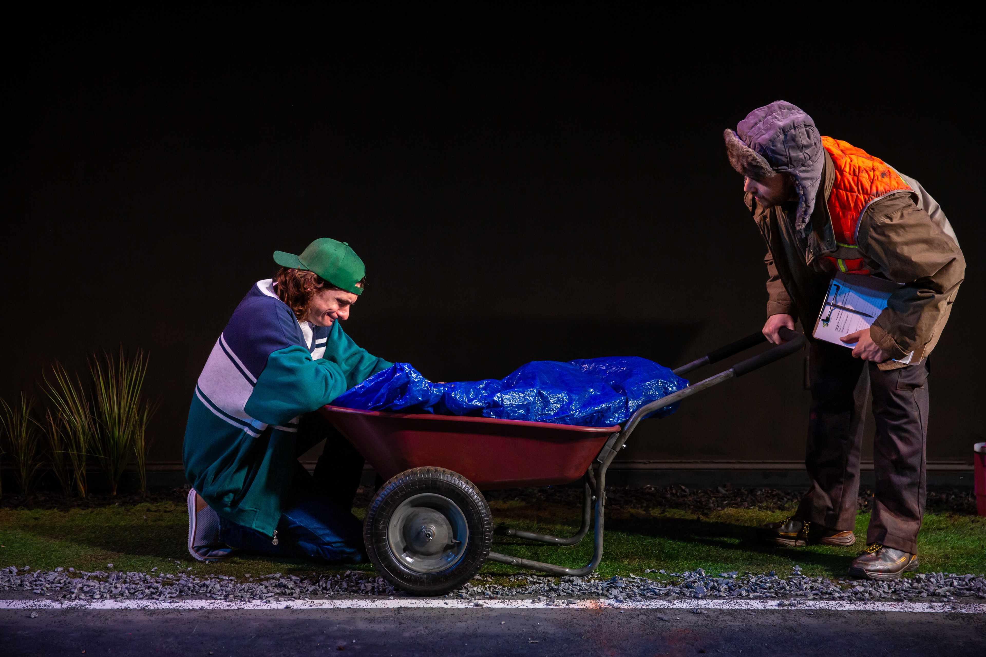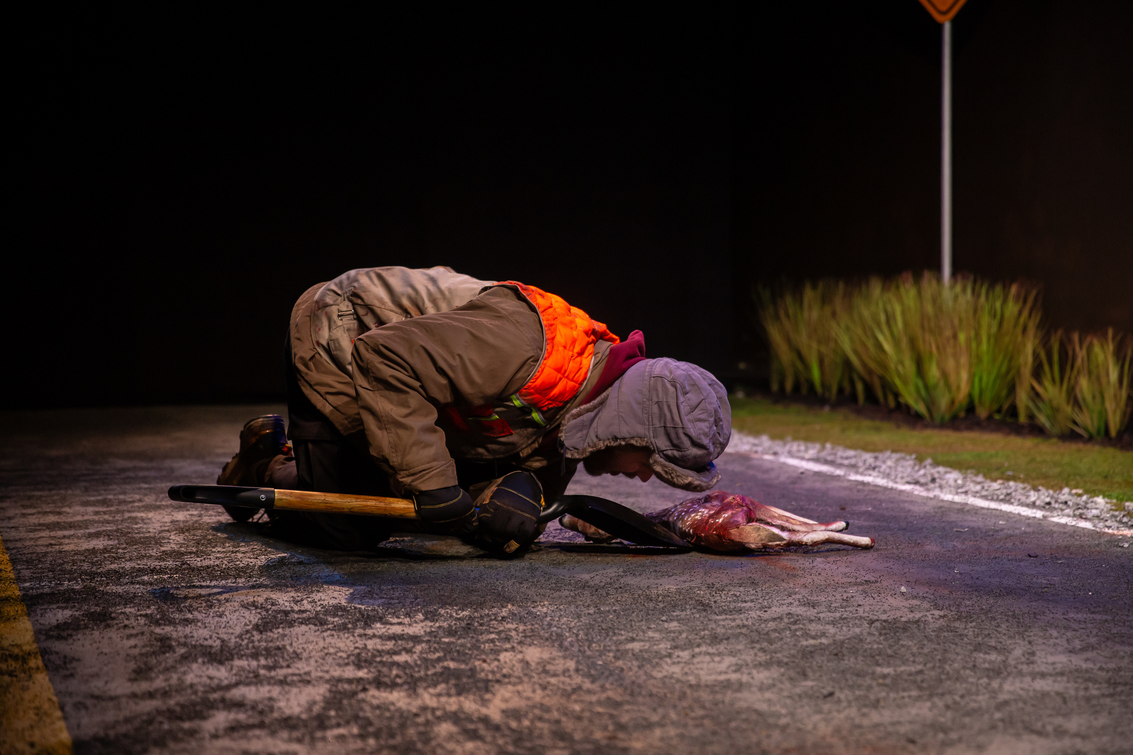 "In a lesser production, these moments might feel like mere connective tissue—practical stage business designed to cover transitions. Here, they become meditative pauses, underscoring the ritualistic monotony of the protagonists’ work while subtly echoing the thematic undertow of the piece. The sound of tires skidding, the sudden thud of impact, the fading echo of a car accelerating into indifference—each auditory tableau renders the moment of an animal’s demise with stark specificity, yet without sentimentality. It’s not melodrama; it’s inevitability.