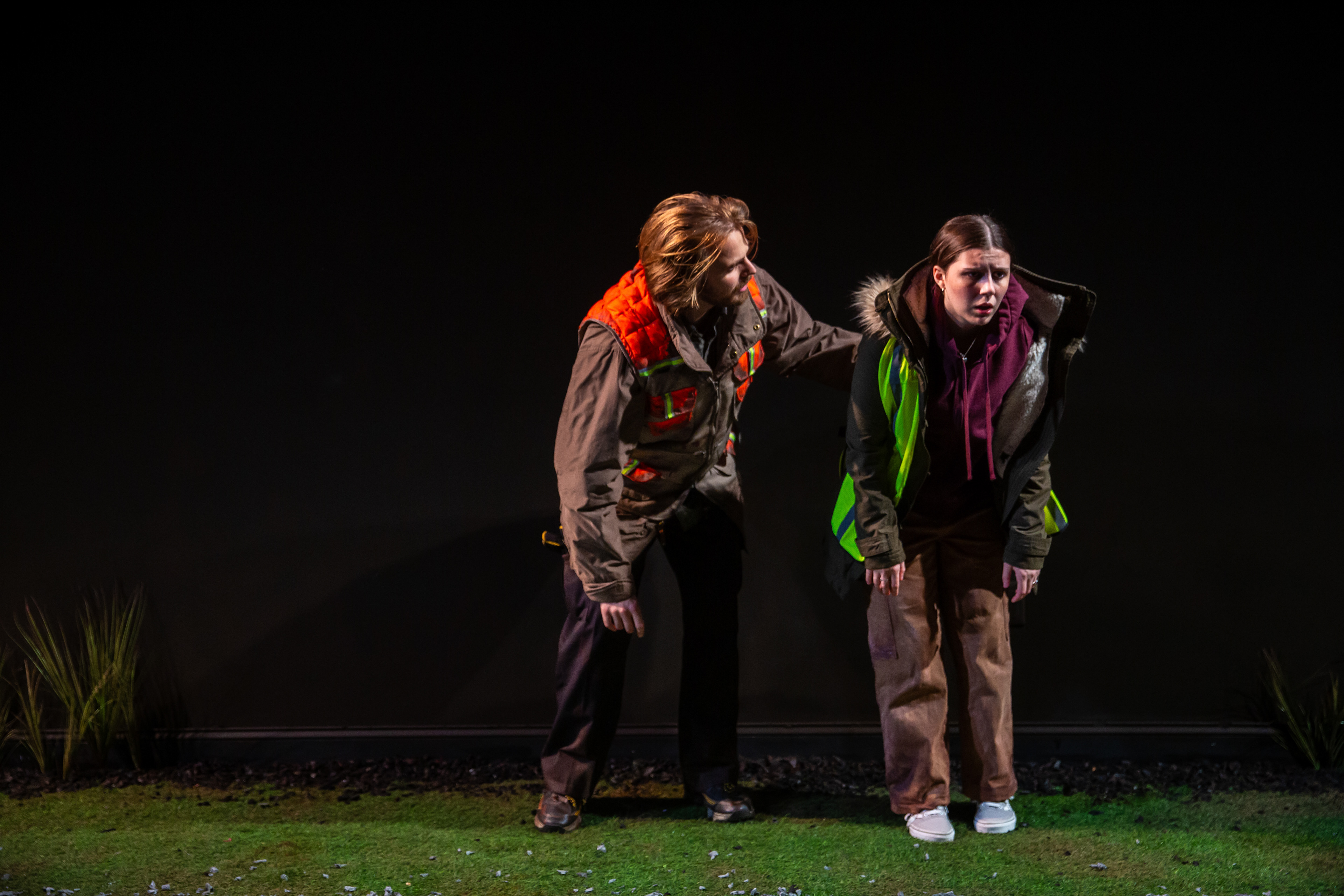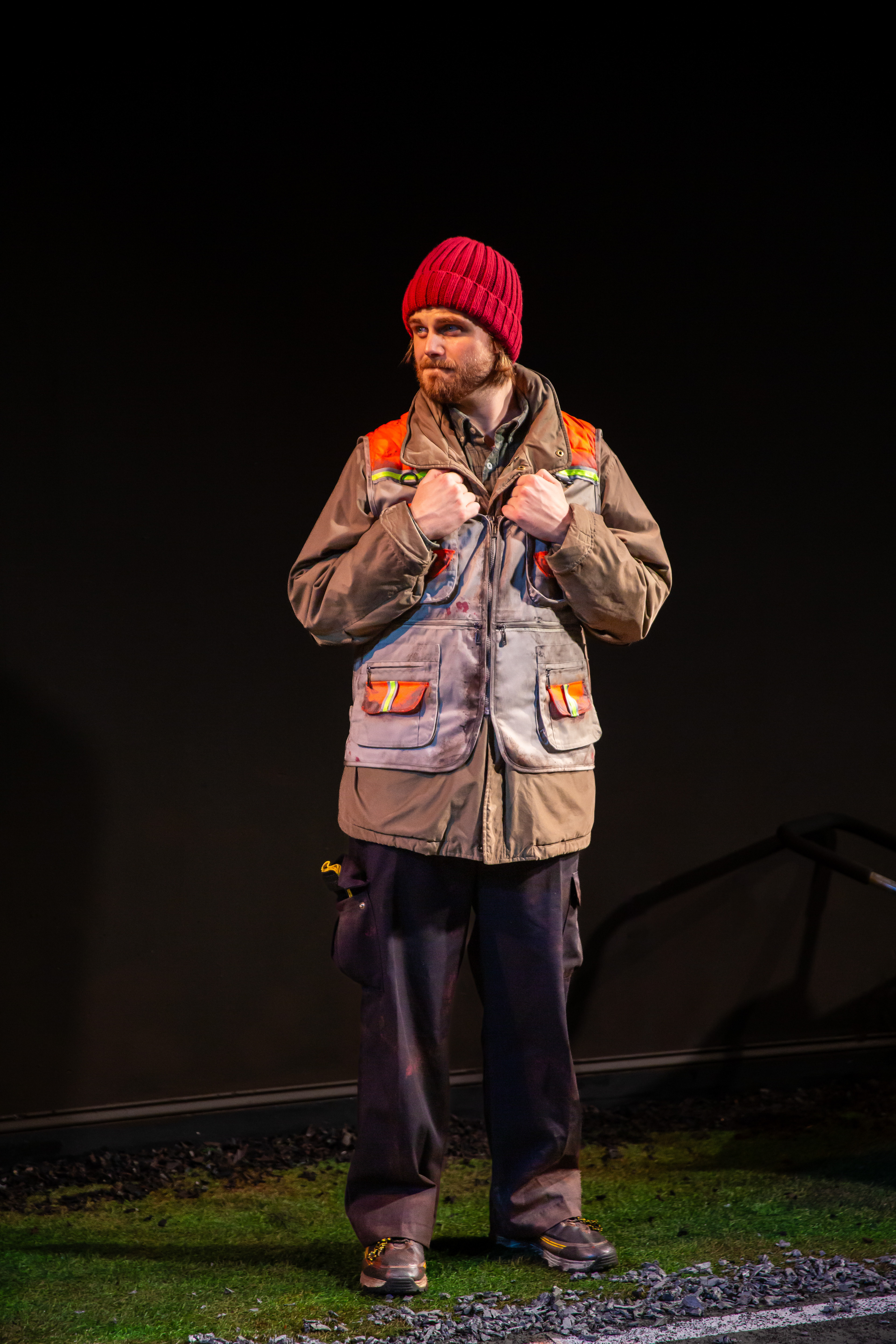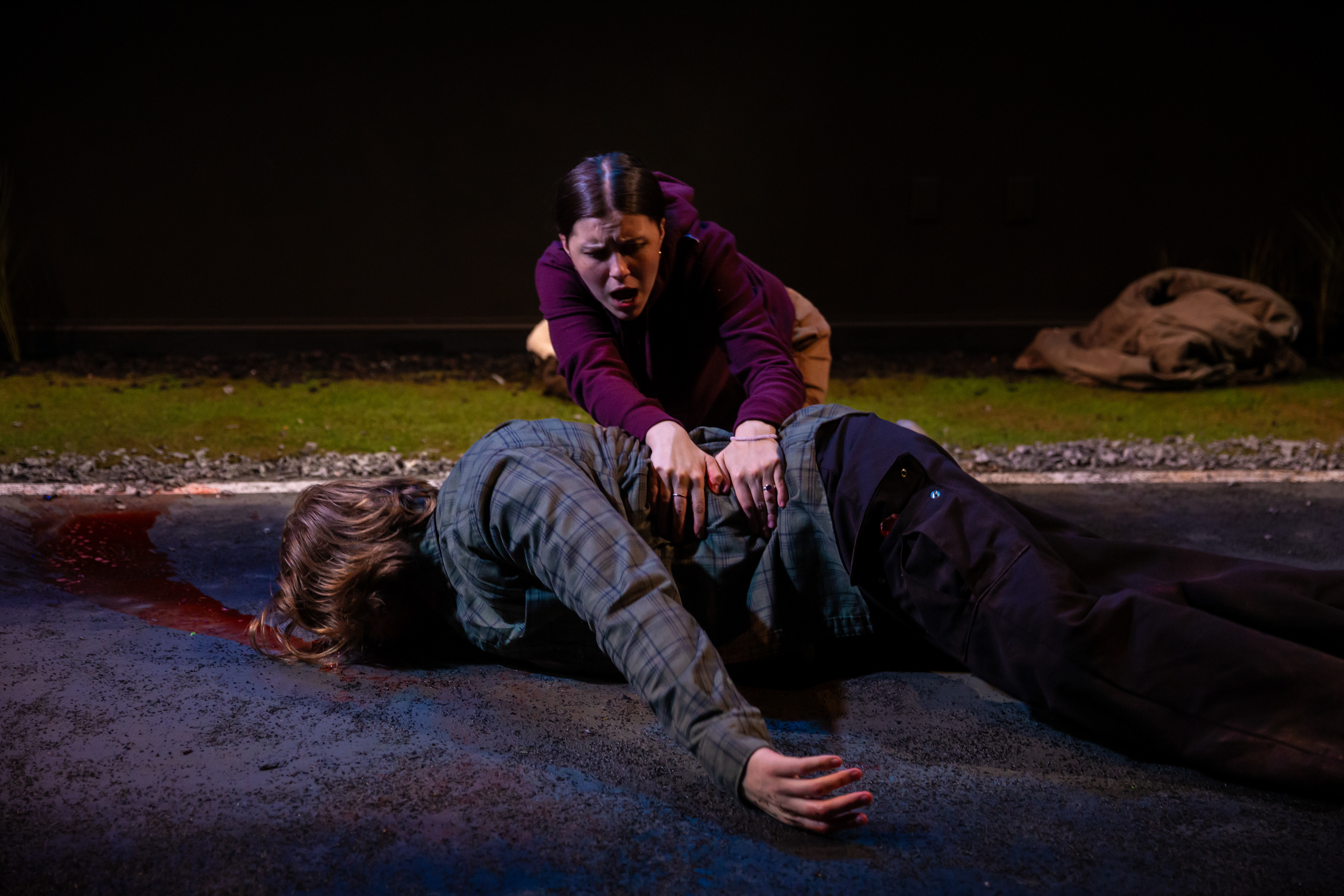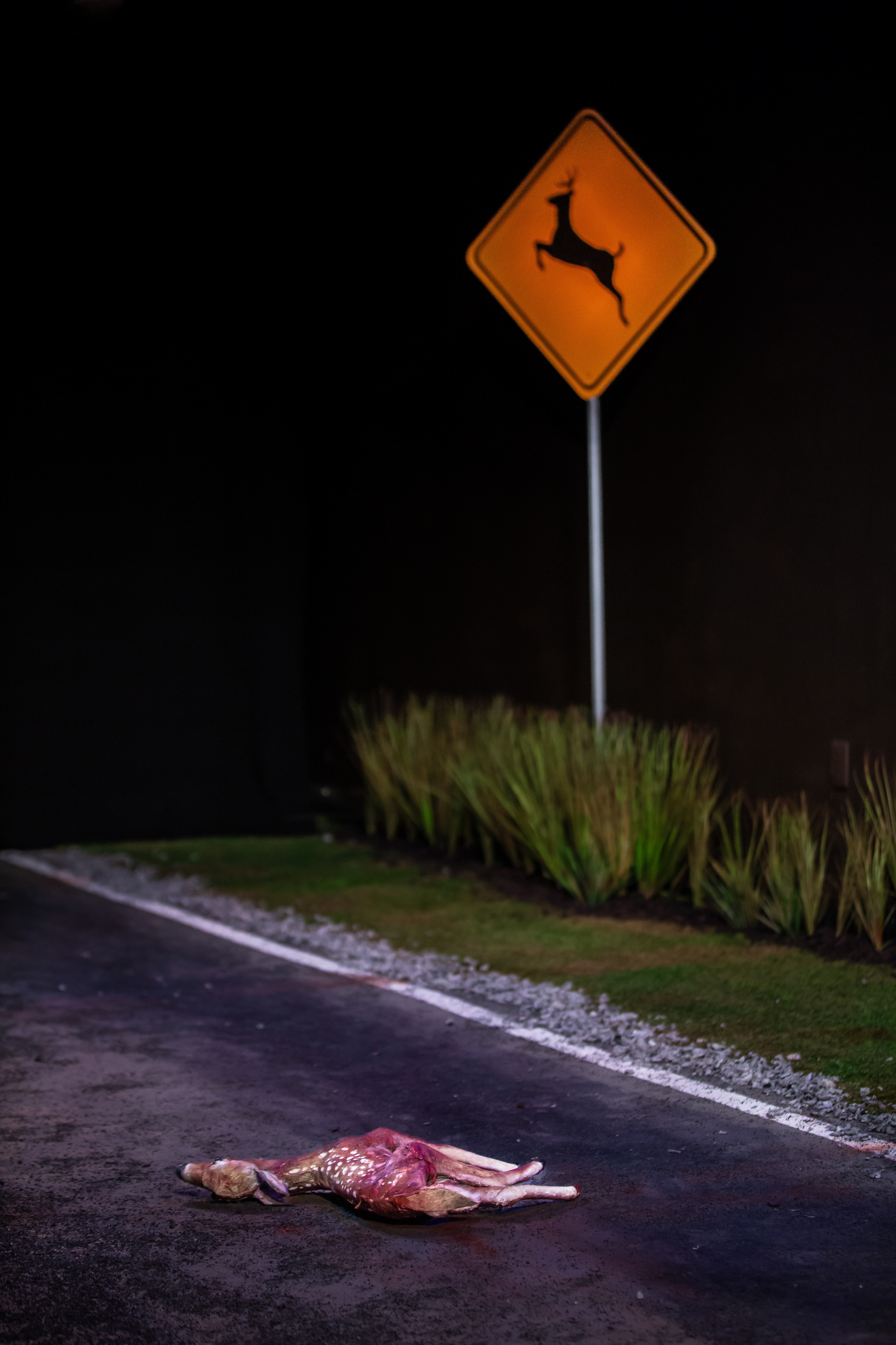 "In a lesser production, these moments might feel like mere connective tissue—practical stage business designed to cover transitions. Here, they become meditative pauses, underscoring the ritualistic monotony of the protagonists’ work while subtly echoing the thematic undertow of the piece. The sound of tires skidding, the sudden thud of impact, the fading echo of a car accelerating into indifference—each auditory tableau renders the moment of an animal’s demise with stark specificity, yet without sentimentality. It’s not melodrama; it’s inevitability.