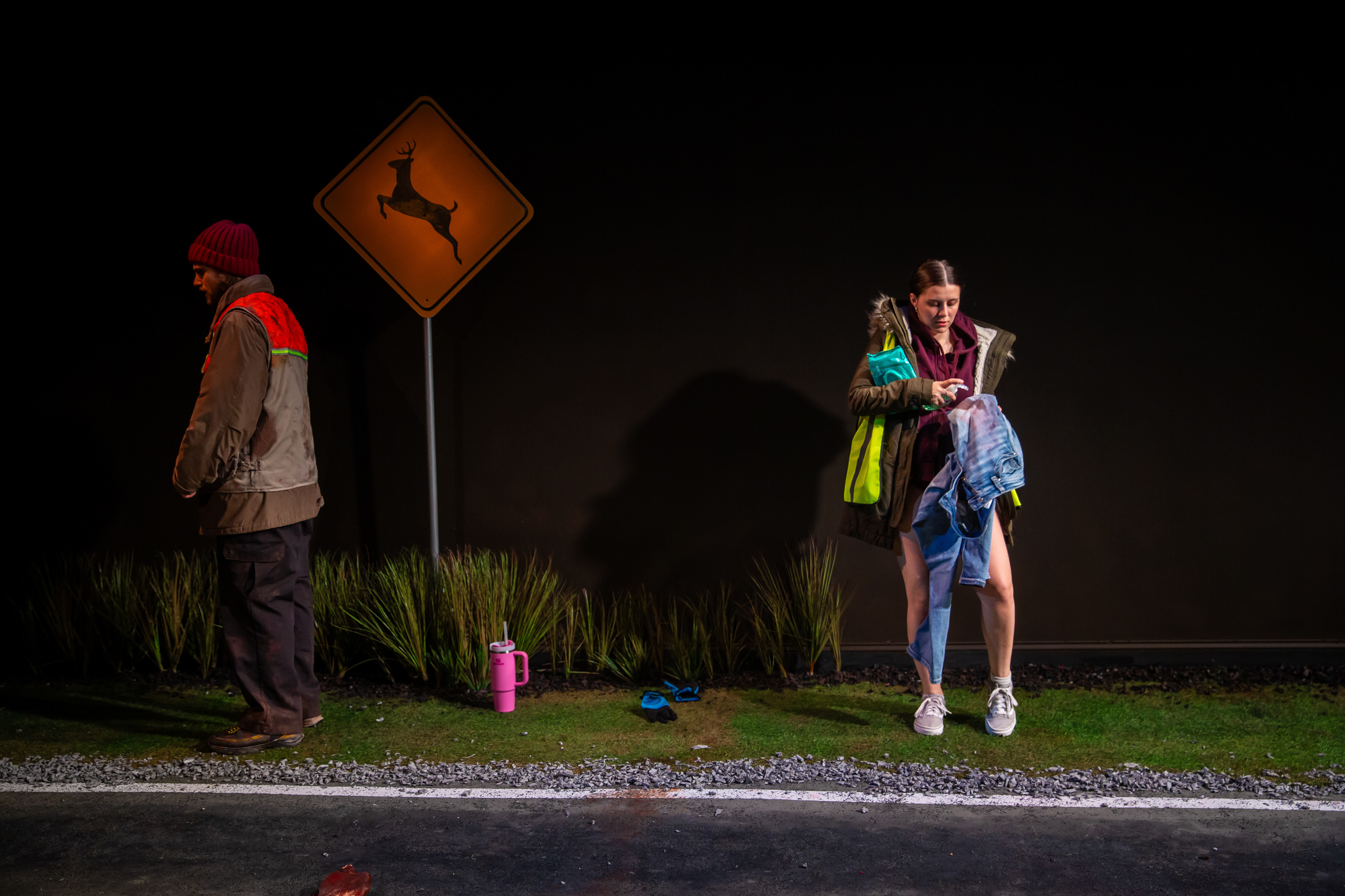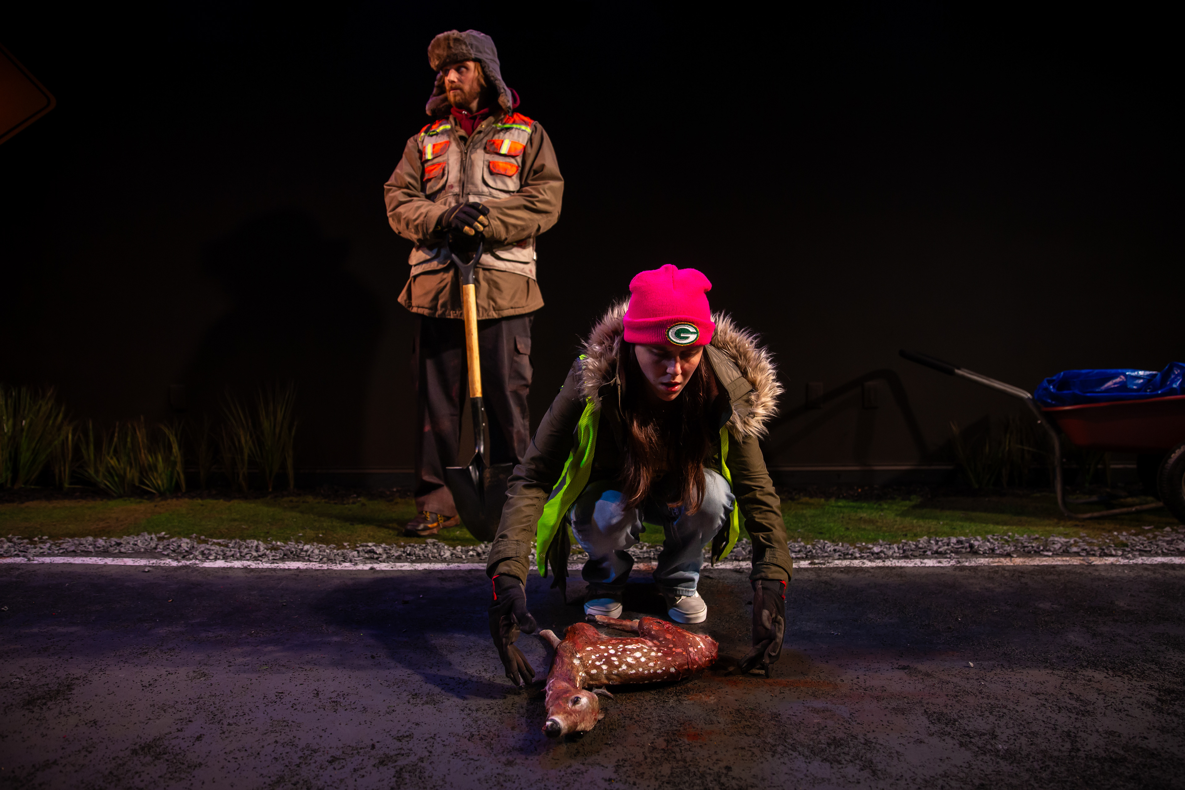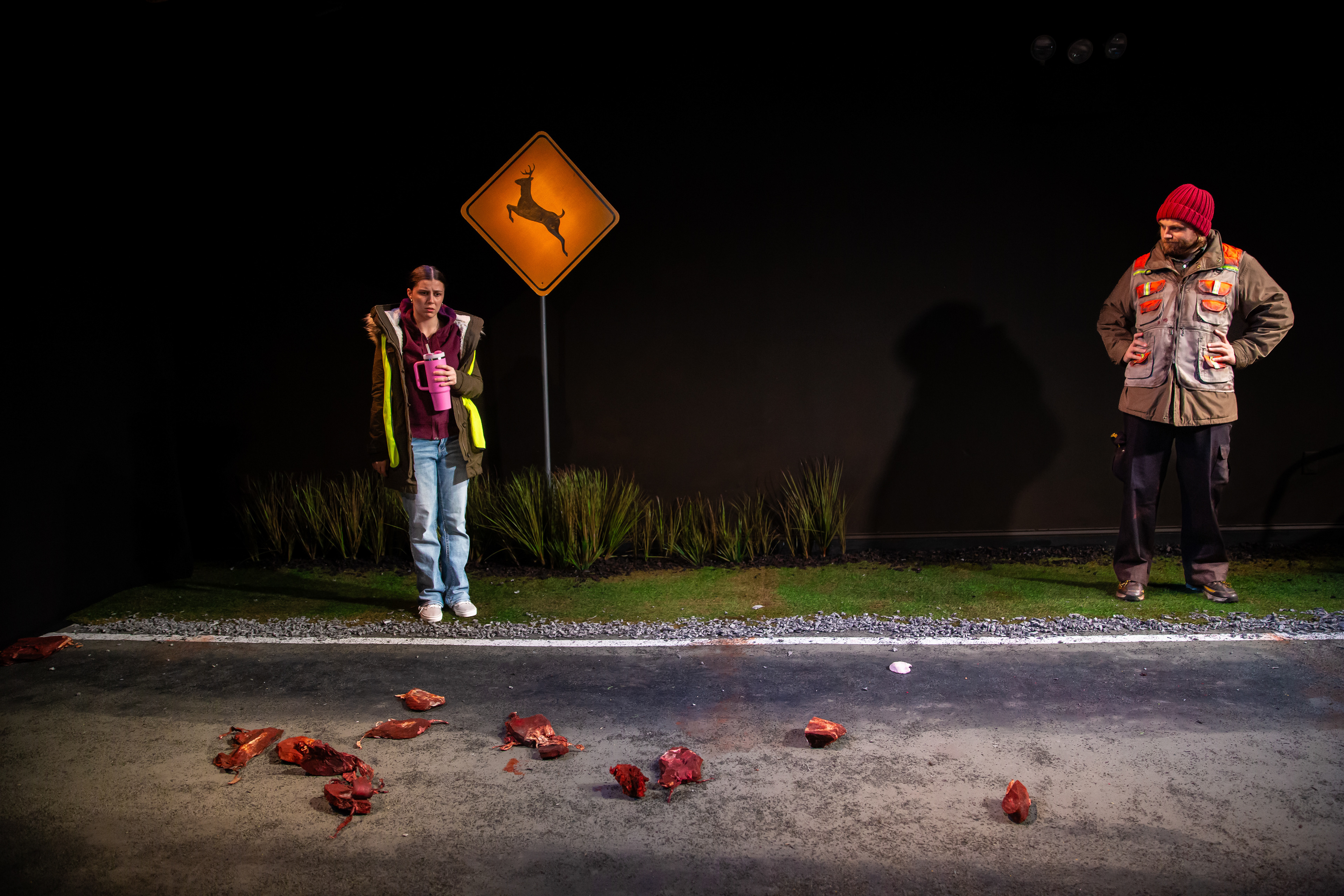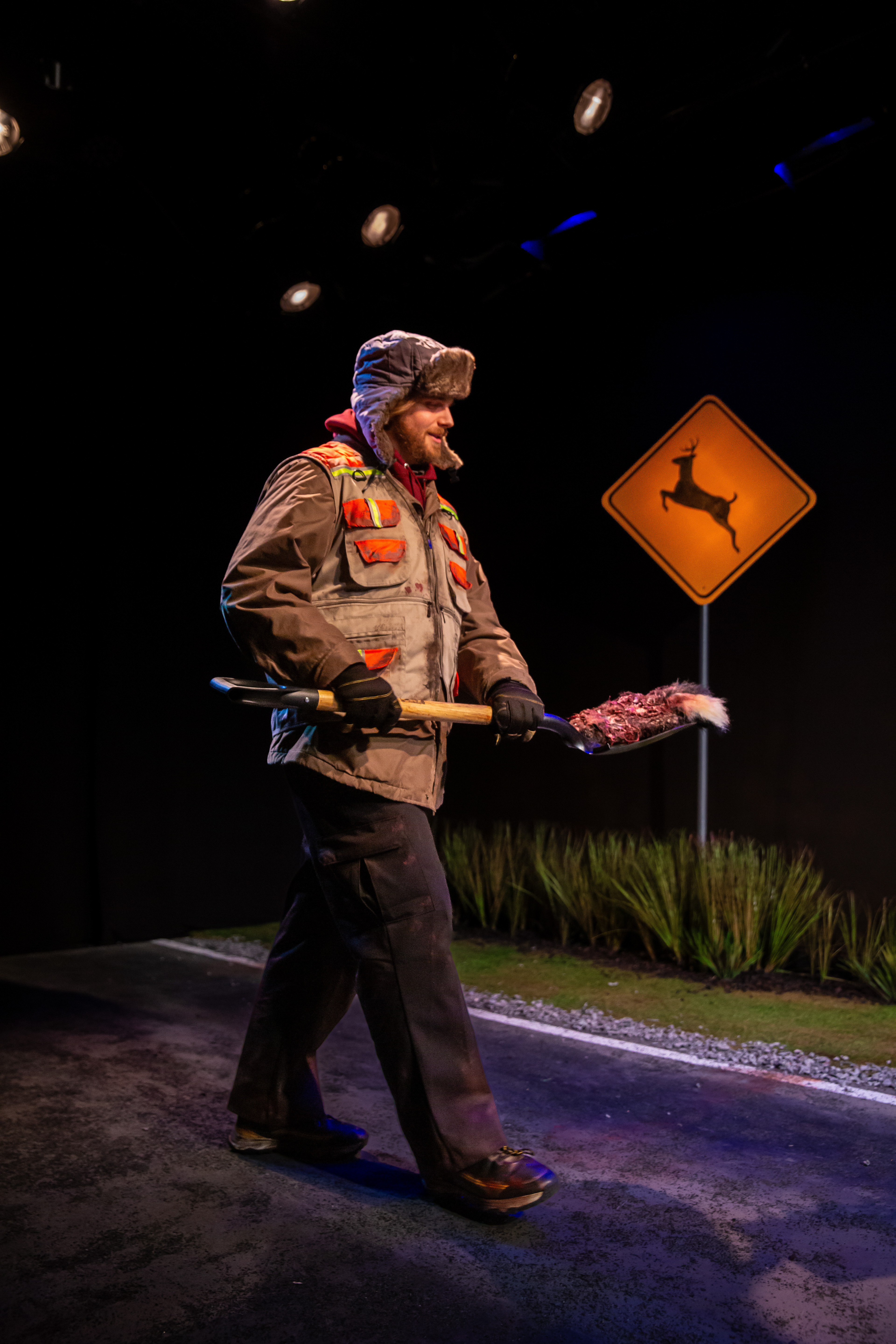 The production embraces minimalism not as a budgetary necessity but as an aesthetic choice. Junran “Charlotte” Shi’s set is marvelously unassuming—a strip of road, a patch of grass, a lone 'deer crossing' sign—but in its sparseness lies its eloquence. Each scene begins with the discovery of a new carcass, courtesy of Sean Frank’s tragic-end props. Sound designer Max Van and lighting designer Paige Seber orchestrate these transitions masterfully, creating a cinematic sense of immersion. Under Seber’s clean, confident lighting, the stage becomes a liminal space: somewhere between nowhere and everywhere. Saawan Tiwari’s costumes are a constant confirmation of Midwestern cold. Goodheart’s directorial hand is light but unmistakable. She threads the play’s humor and heartbreak with such precision that the tonal shifts never feel jarring, only inevitable."
