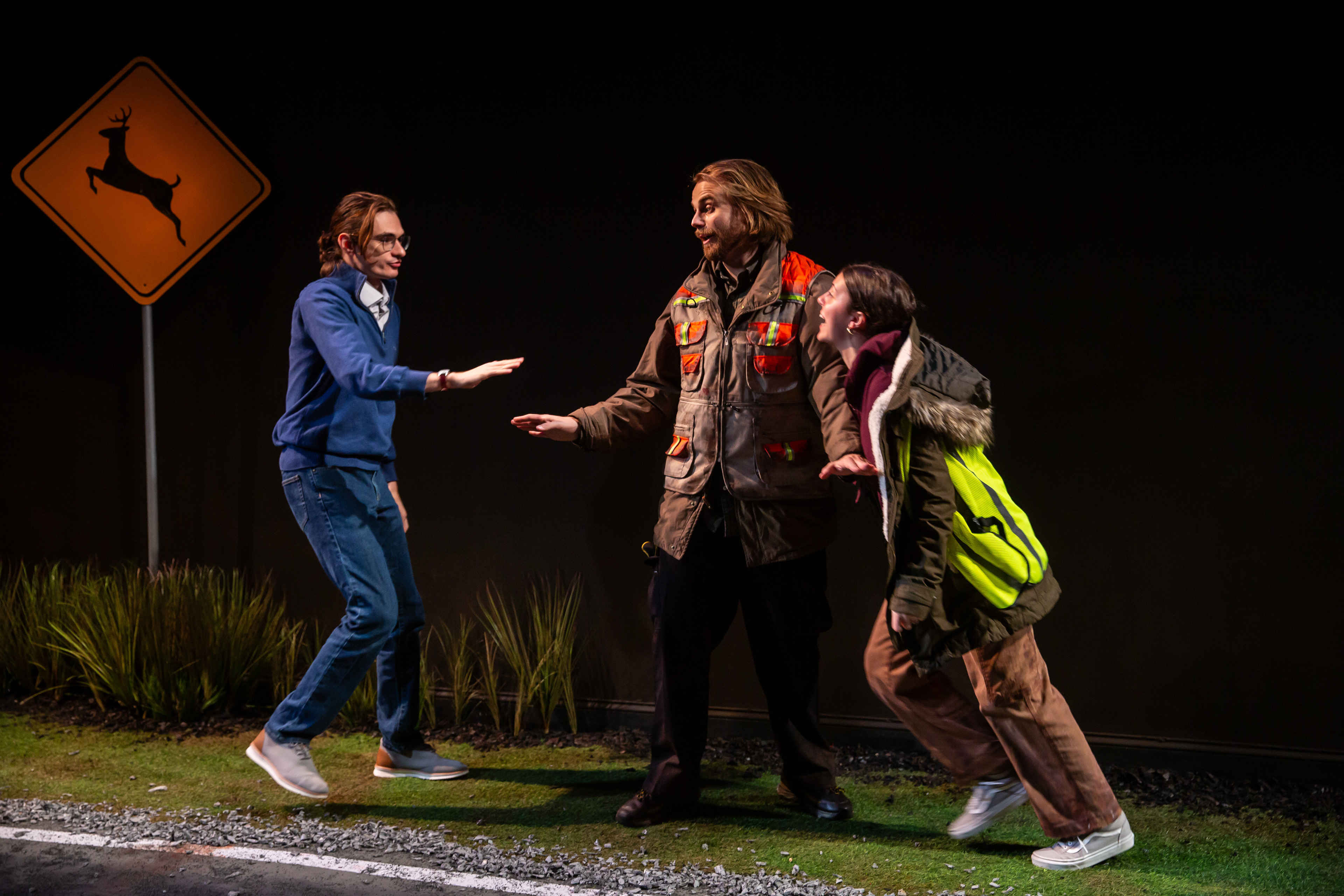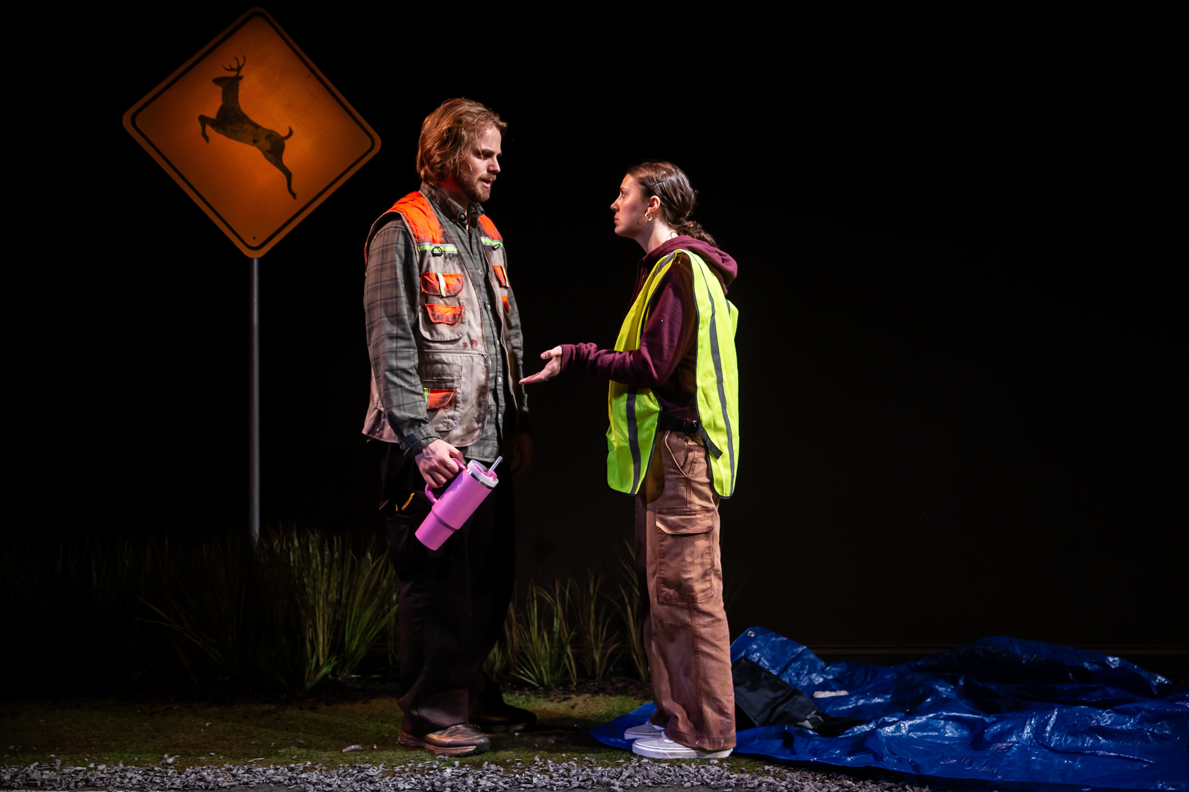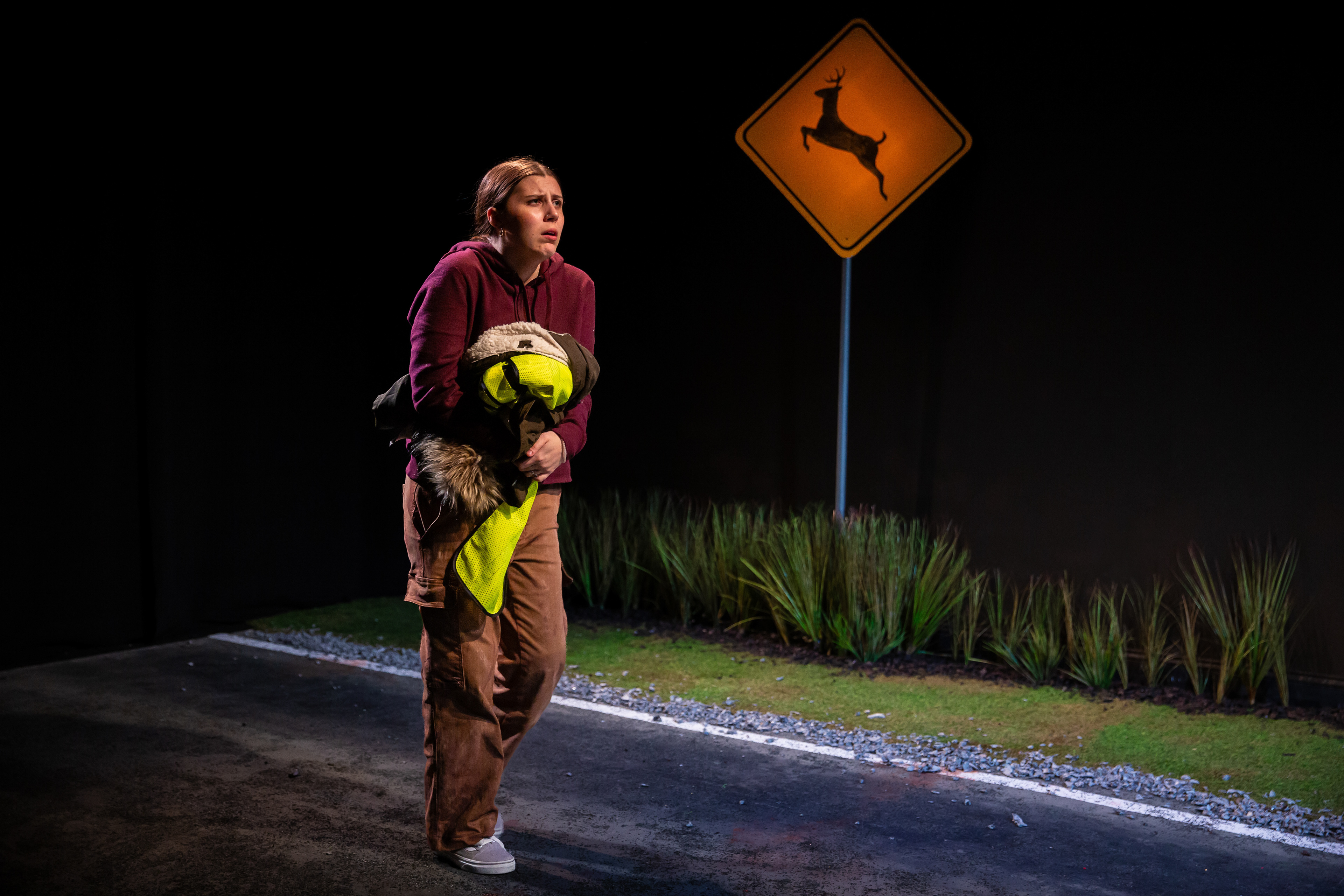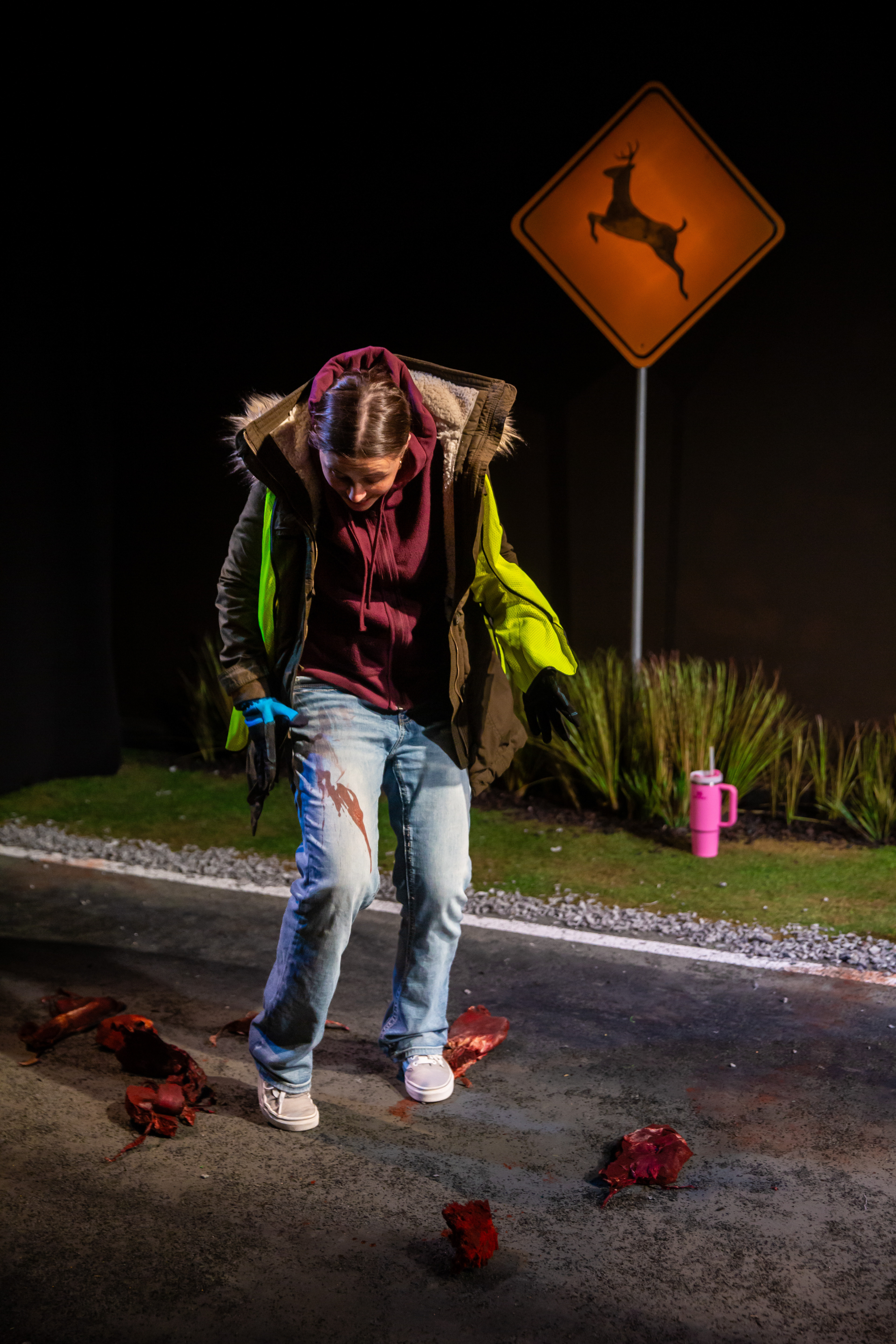 The production embraces minimalism not as a budgetary necessity but as an aesthetic choice. Junran “Charlotte” Shi’s set is marvelously unassuming—a strip of road, a patch of grass, a lone 'deer crossing' sign—but in its sparseness lies its eloquence. Each scene begins with the discovery of a new carcass, courtesy of Sean Frank’s tragic-end props. Sound designer Max Van and lighting designer Paige Seber orchestrate these transitions masterfully, creating a cinematic sense of immersion. Under Seber’s clean, confident lighting, the stage becomes a liminal space: somewhere between nowhere and everywhere. Saawan Tiwari’s costumes are a constant confirmation of Midwestern cold. Goodheart’s directorial hand is light but unmistakable. She threads the play’s humor and heartbreak with such precision that the tonal shifts never feel jarring, only inevitable."