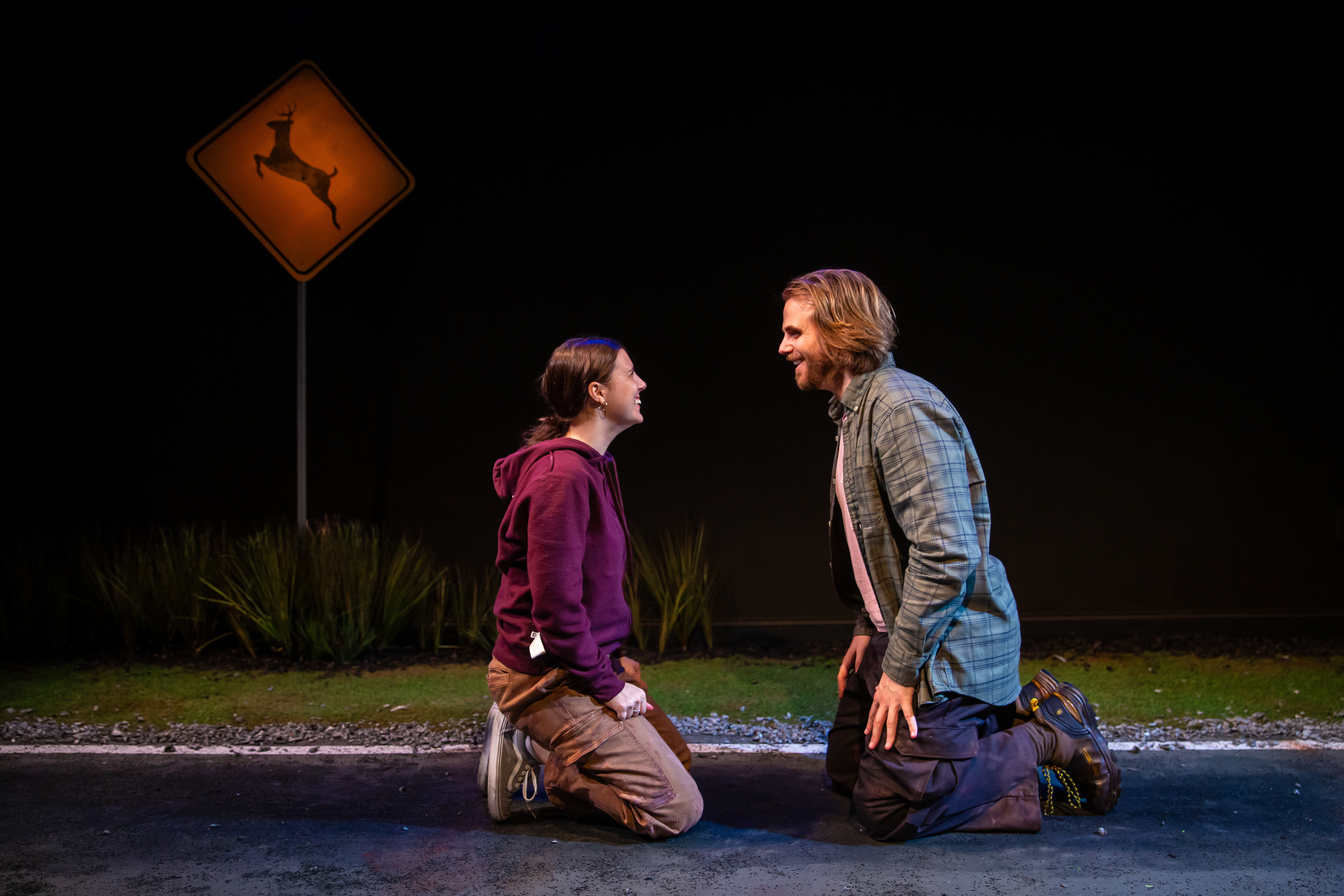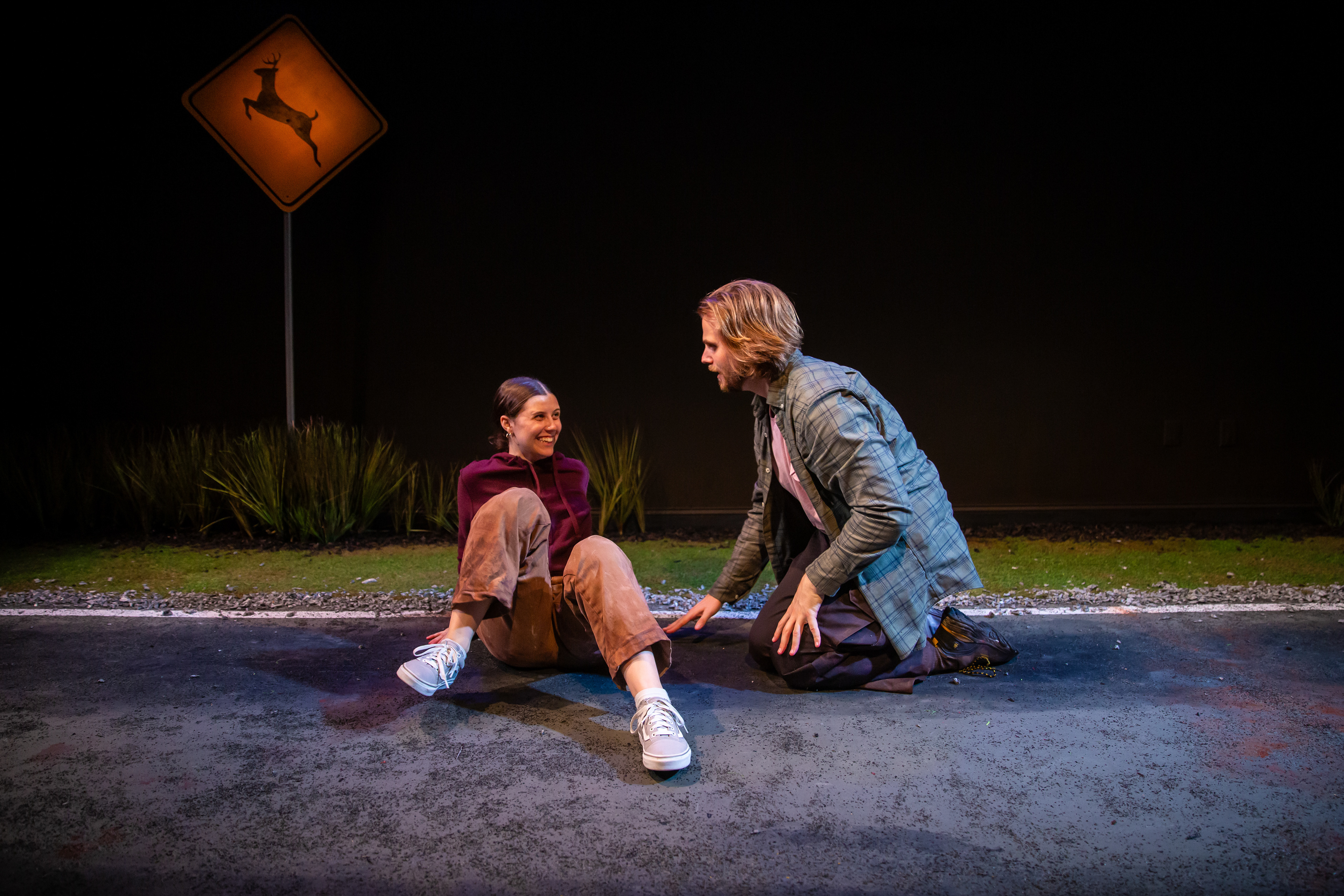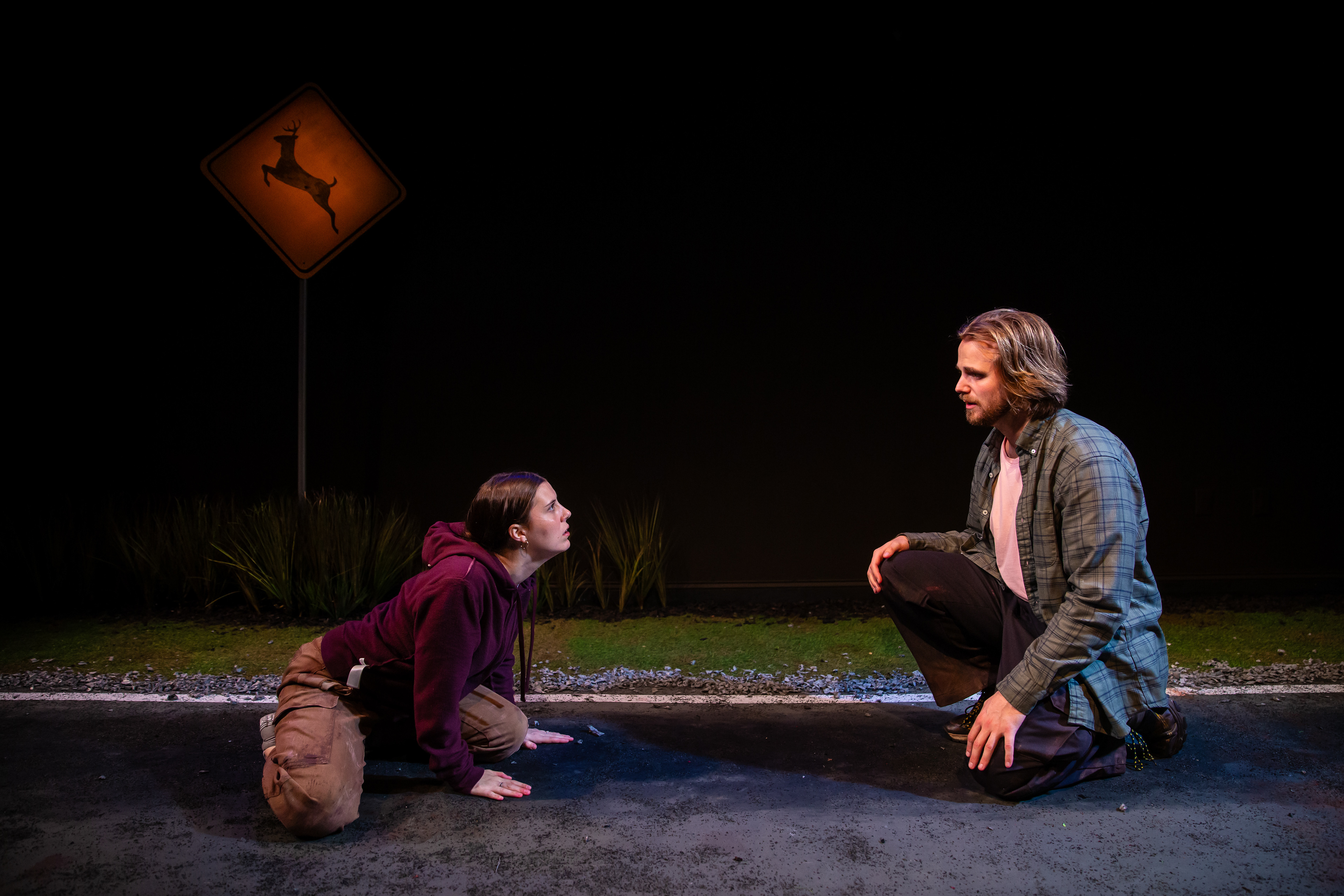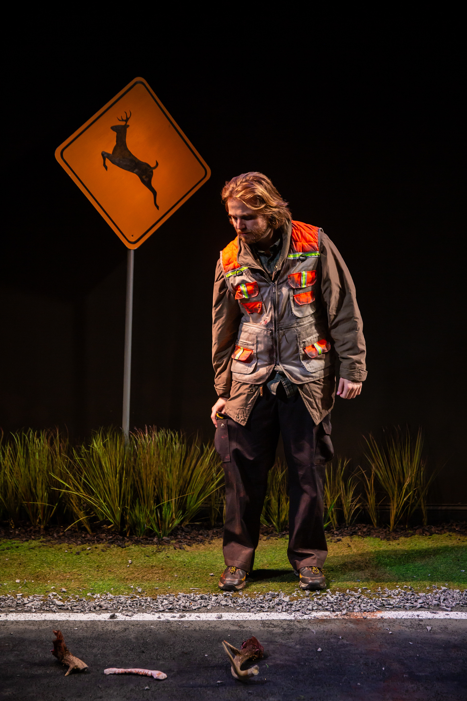 The production embraces minimalism not as a budgetary necessity but as an aesthetic choice. Junran “Charlotte” Shi’s set is marvelously unassuming—a strip of road, a patch of grass, a lone 'deer crossing' sign—but in its sparseness lies its eloquence. Each scene begins with the discovery of a new carcass, courtesy of Sean Frank’s tragic-end props. Sound designer Max Van and lighting designer Paige Seber orchestrate these transitions masterfully, creating a cinematic sense of immersion. Under Seber’s clean, confident lighting, the stage becomes a liminal space: somewhere between nowhere and everywhere. Saawan Tiwari’s costumes are a constant confirmation of Midwestern cold. Goodheart’s directorial hand is light but unmistakable. She threads the play’s humor and heartbreak with such precision that the tonal shifts never feel jarring, only inevitable."