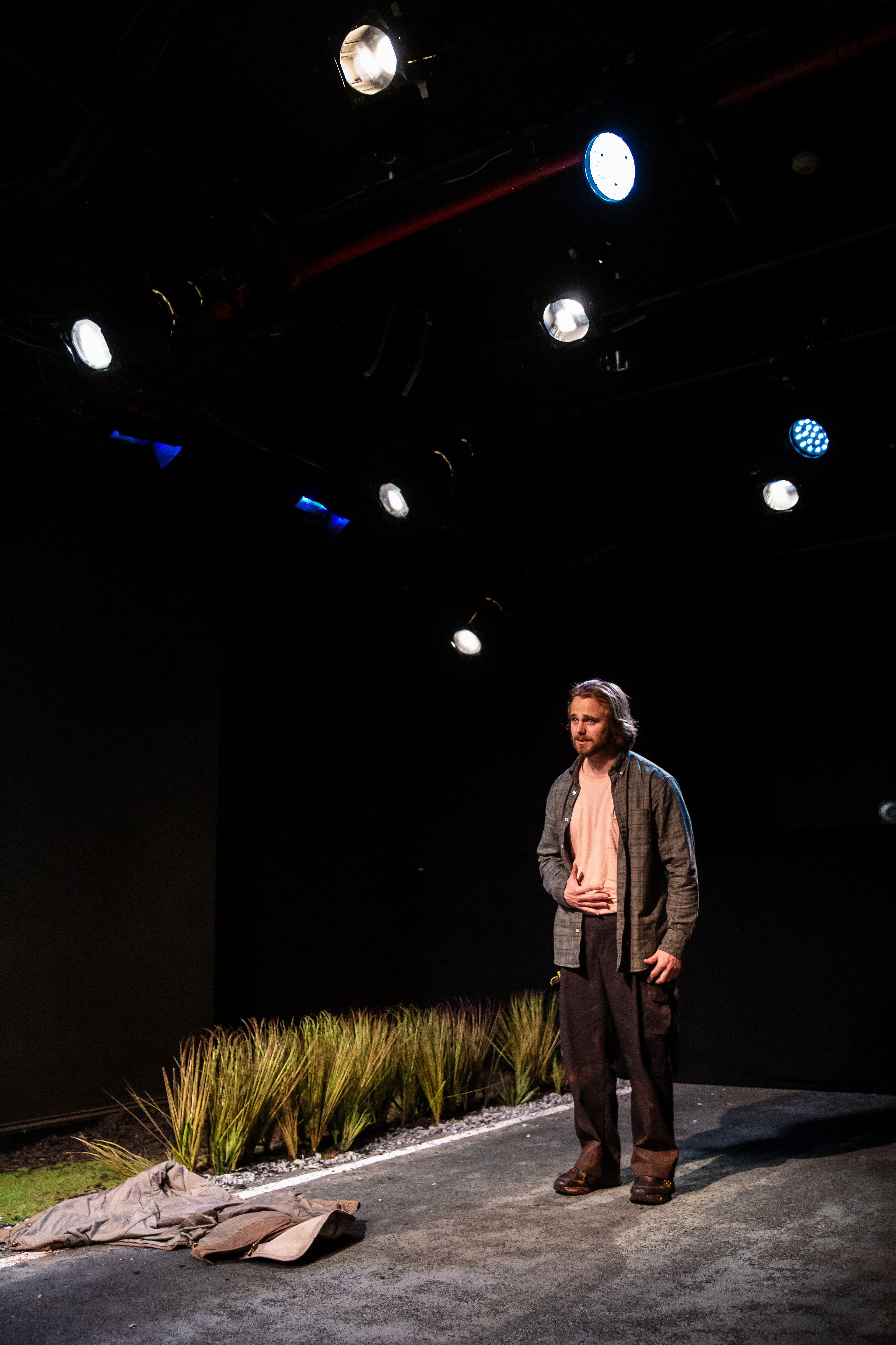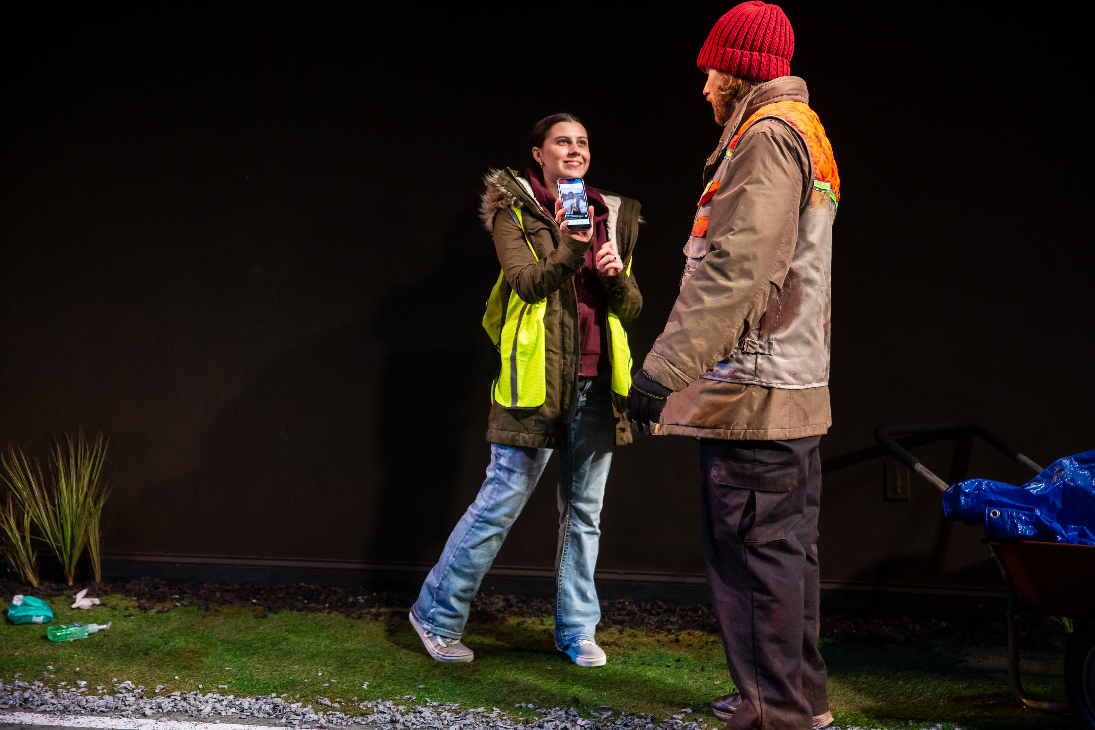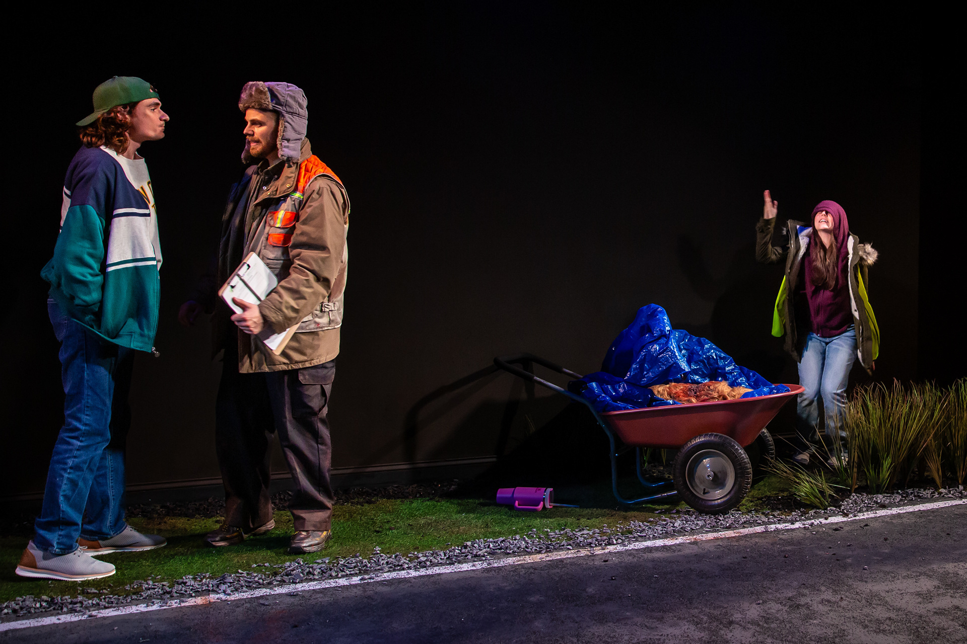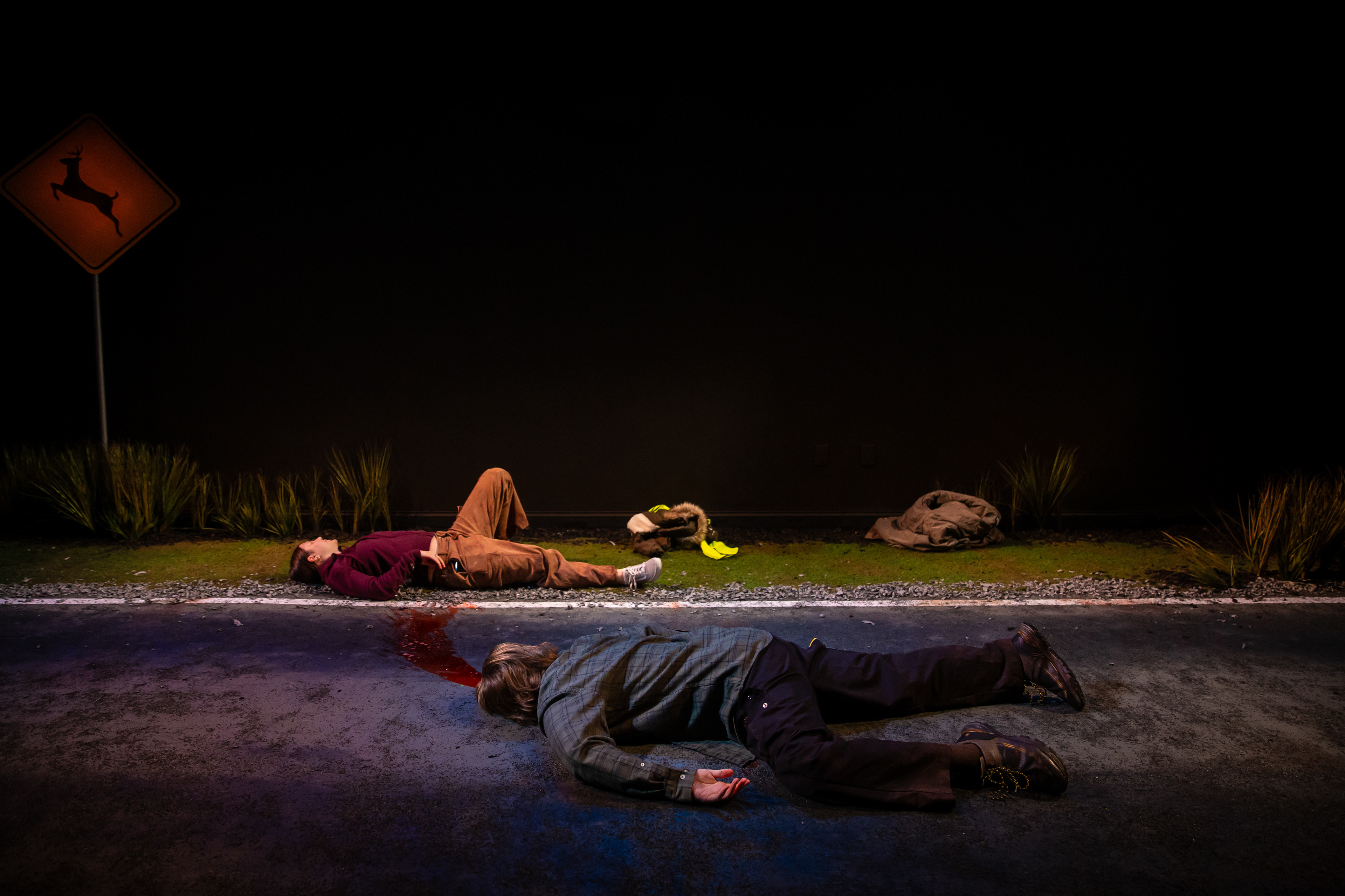 The production embraces minimalism not as a budgetary necessity but as an aesthetic choice. Junran “Charlotte” Shi’s set is marvelously unassuming—a strip of road, a patch of grass, a lone 'deer crossing' sign—but in its sparseness lies its eloquence. Each scene begins with the discovery of a new carcass, courtesy of Sean Frank’s tragic-end props. Sound designer Max Van and lighting designer Paige Seber orchestrate these transitions masterfully, creating a cinematic sense of immersion. Under Seber’s clean, confident lighting, the stage becomes a liminal space: somewhere between nowhere and everywhere. Saawan Tiwari’s costumes are a constant confirmation of Midwestern cold. Goodheart’s directorial hand is light but unmistakable. She threads the play’s humor and heartbreak with such precision that the tonal shifts never feel jarring, only inevitable."