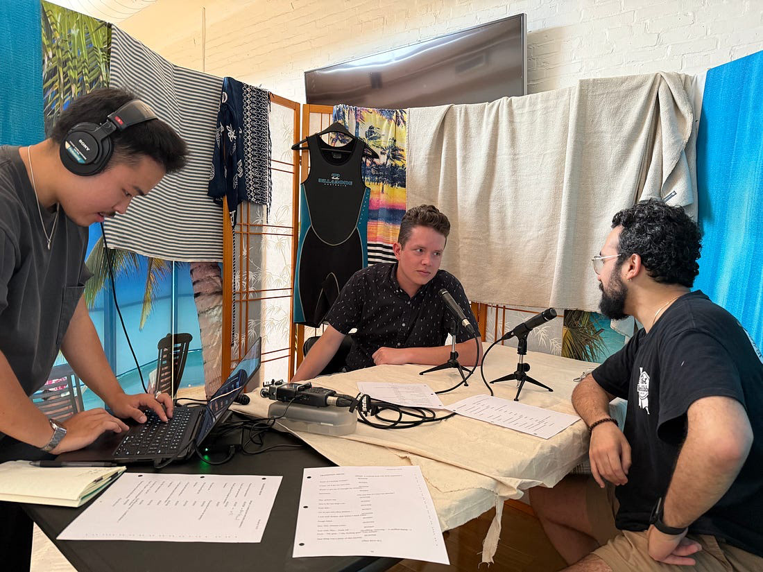 All of the voice-over recordings were done with two SM57s connected to the Zoom H5 as an audio interface and directly recorded to Logic Pro. A make-shift recording studio was set up in our rehearsal room, which doubled as a surf class studio in the evenings, hence the background wetsuit in the image below. All of our voice-over performers were absolute delights! The collaboration between Nina, Sophie, the performers, and me was charmingly playful.